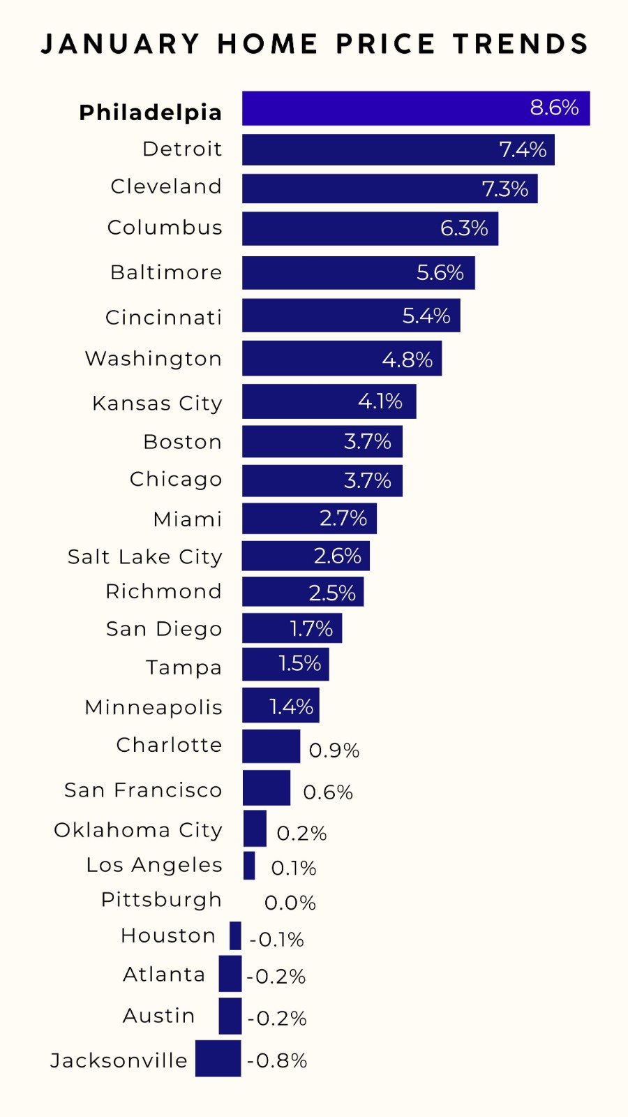 Greater Philadelphia home prices rose 8.6% year over year in January 2026, the highest increase among 40 major U.S. metros, according to a new report.